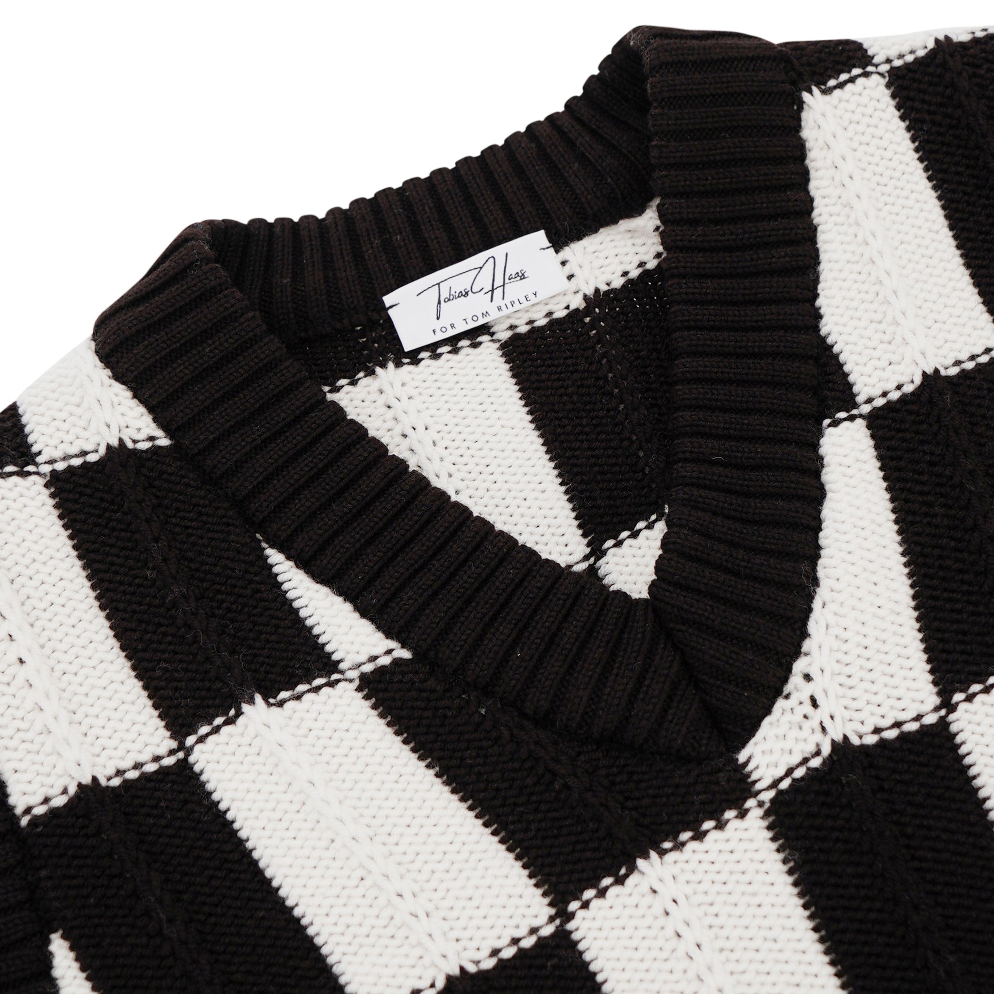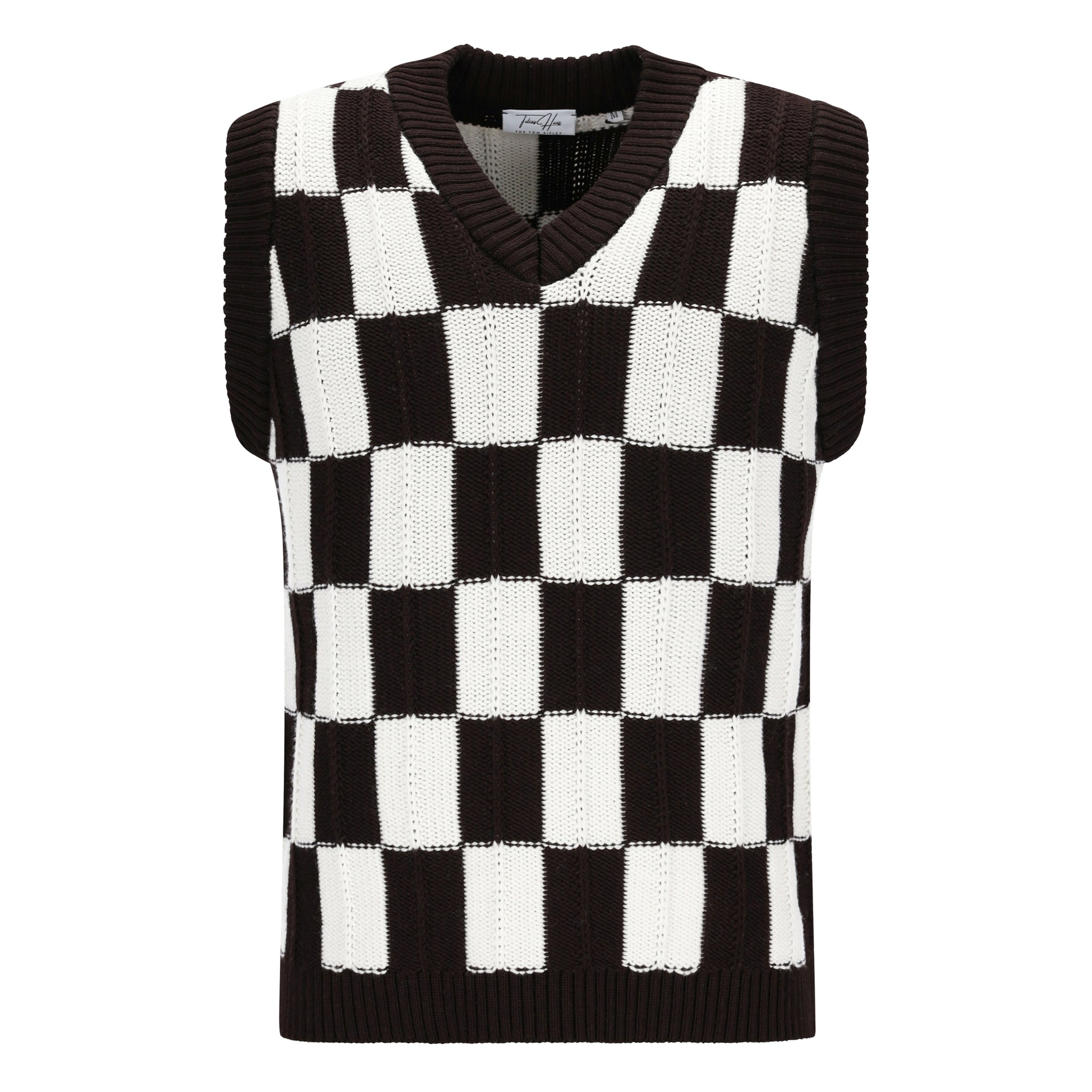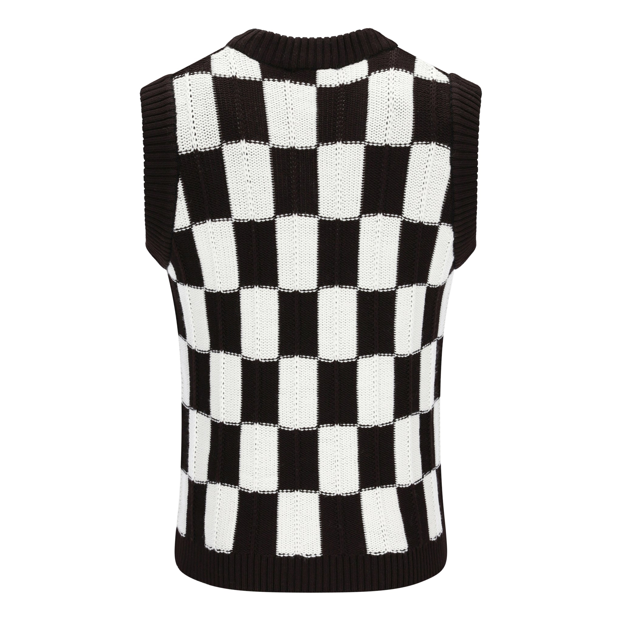 Das markante Schachbrettmuster verleiht dem Pullunder einen trendbewussten Look, ohne dabei den nostalgischen Touch zu verlieren. Eine raffinierte, dezente Strickstruktur verleiht dem zweifarbigen Muster Tiefe. Breite, rustikal gerippte Abschlüsse an V‑Ausschnitt und Armausschnitten setzen kraftvolle Akzente und sorgen dafür, dass der Stil lässig bleibt – ganz ohne spießige Anmutung.